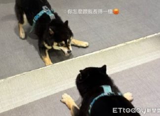 黑柴「跟自己倒影玩」整隻...